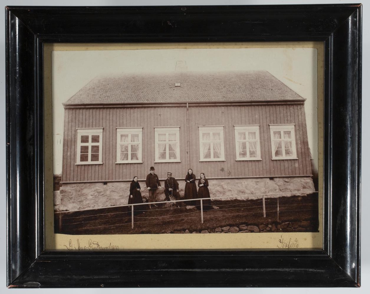 Hópmynd fyrir utan hús (í Stykkishólmi?). Á myndinni eru: Ingibjörg Jensdóttir, kona Hjartar Jónssonar læknis, Hjörtur Jónsson læknir, Sigurður Jónsson sýslumaður, Guðlaug Jensdóttir kona hans og Ragnheiður Jensdóttir, systir Ingibjargar og Guðlaugar.