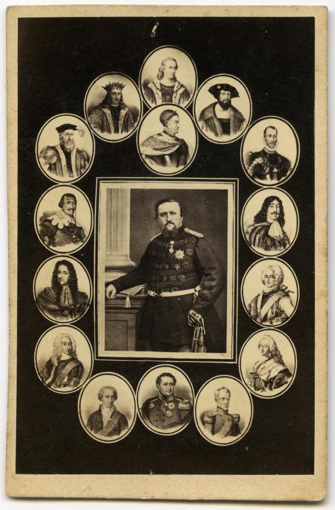 Friðrik 7. Danakonungur og umhverfis hann forfeður hans af Aldinborgarættinni: