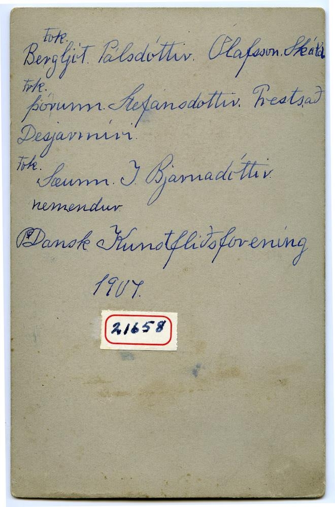Ljósm. cab.: Bergljót Pálsdóttir (skálds Ólafssonar), Þórunn Stefánsdóttir prests á Desjarmýri og Sæunn I. Bjarnadóttir (úr Miðfirði), nemendur hjá Dansk Kunstflidsforening 1907.