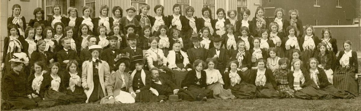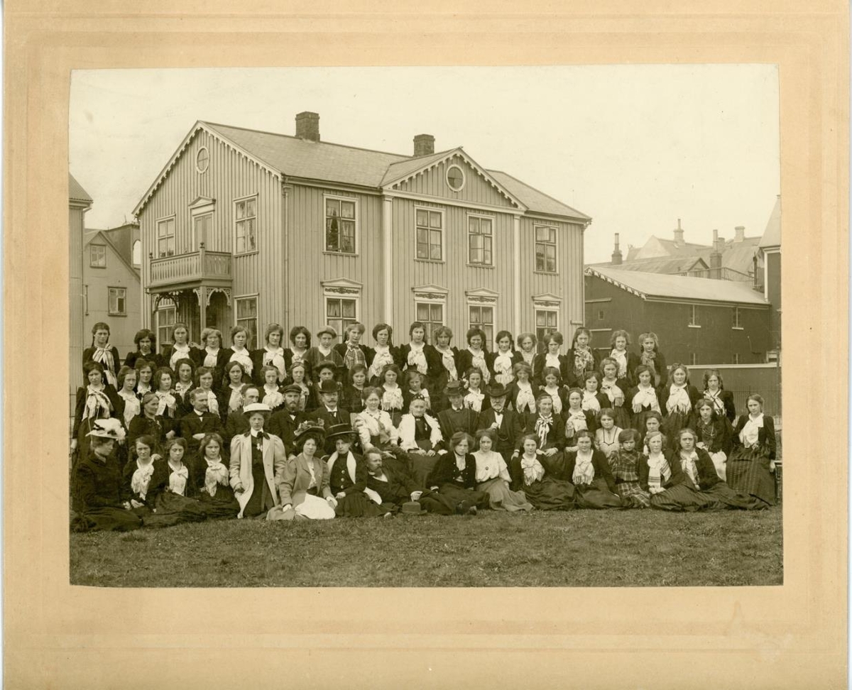 Hópmynd af námsmeyjum og kennurum Kvennaskólans í Reykjavík, um 1908 - 1910 (-12). Á myndinni þekkjast: Þóra Melsteð, Ingibjörg H. Bjarnason, Þórarinn B. Þorláksson listmálari, Sigfús Einarsson tónskáld, Bergljót Lárusdóttir kennari, Páll Melsteð, (d. 1910), úr hóp nemenda Sigríður Bjarnadóttir, kona Guðjóns Jónssonar bryta.