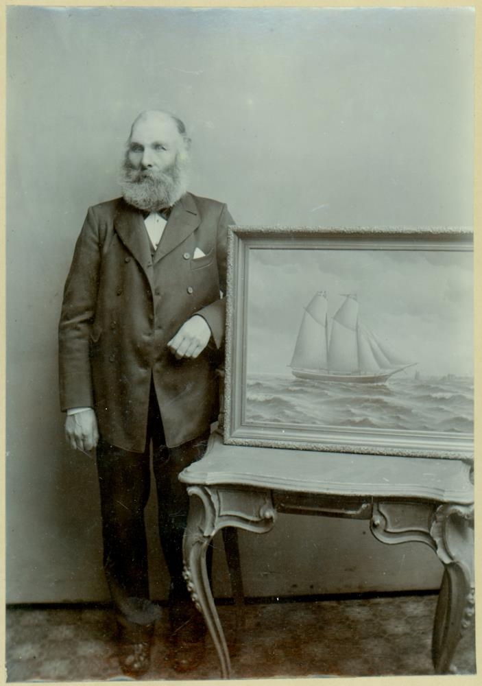 Siguður stendur við hlið málverks af Ssk Geir, skonnortu sem var smíðuð fyrir hann.