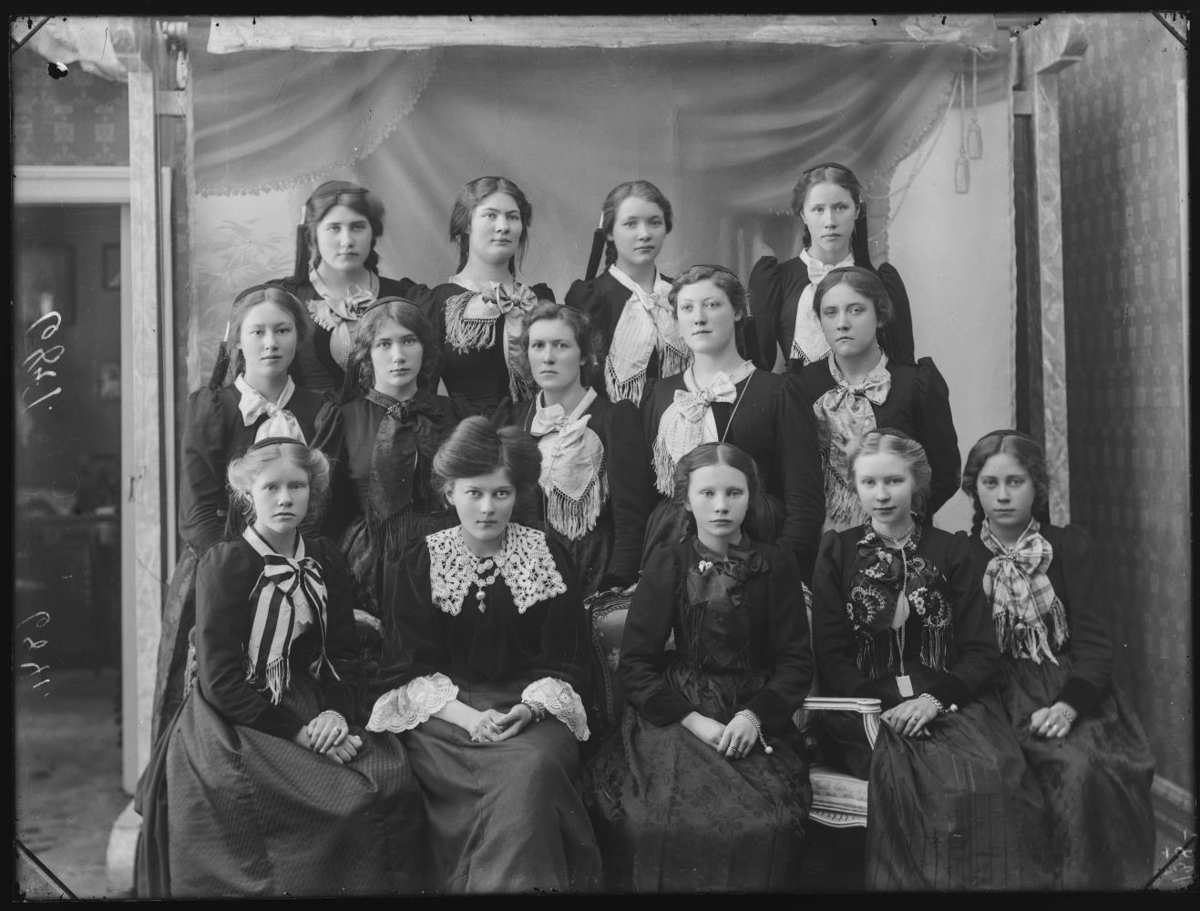 Kvennaskólastúlkur. Efsta röð: Elísabet Friðriksdóttir frá Lágadal, Ástríður Jónsdóttir frá Vilmundarstöðum, Guðrún Árnadóttir og Bergþóra Kristjánsdóttir frá Meðaldal í Dýrafirði. Miðröð: Guðrún Guðmundsdóttir kona Steindórs Björnssonar frá Gröf, Jóna Jónsdóttir frá Valshamri í Mýrarsýslu, Guðrún Kristjánsdóttir frá Múla Ísafj.sýslu, Stefanía Guðmundsdóttir frá Ási í Hegranesi og Guðrún Ásmundsdóttir frá Hábæ Vatnsleysuströnd. Fremsta röð: Magðalena Guðjónsd. hjúkrunarkona, Soffía Siemsen g. Kjaran, Guðrún Snæbjarnard. systir Bjarnalæknis og Ingibjörg Jónsdóttir.