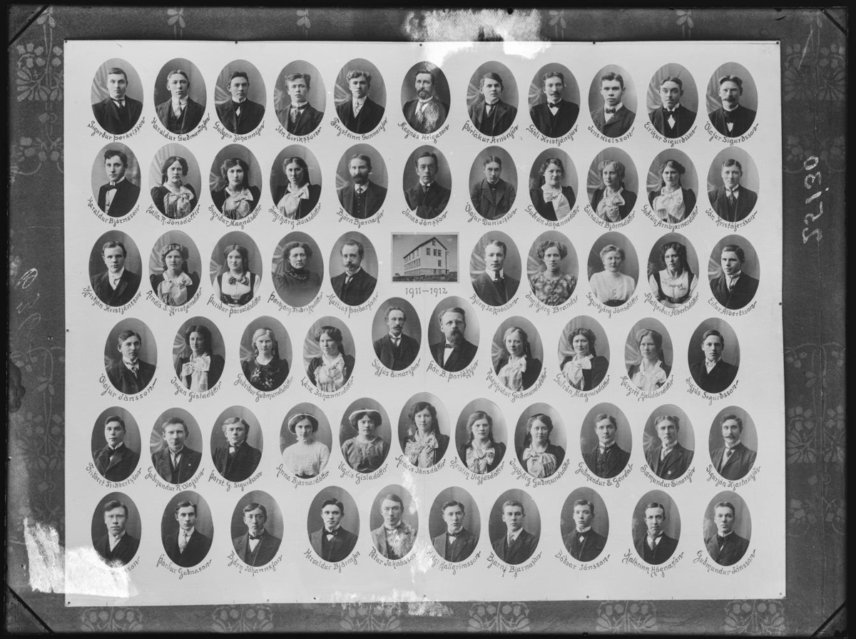 Kennarar og nemendur Kennaraskólans veturinn 1911-12: Sigurður Þorkelsson, Haraldur Guðmundsson, Guðgeir Jóhannsson, Jón Eiríksson, Freysteinn Gunnarsson, sra Magnús Helgason, Þorlákur Arnórsson, Gísli Kristjánsson, Jens Níelsson, Eiríkur Sigurðsson og Ólafur Sigurðsson, Haraldur Björnsson (leikari), Halla R. Jónsdóttir, Sigríður Magnúsdóttir, Ingibjörg Jónsdóttir, Jónas frá Hriflu, dr. Ólafur Dan., Guðrún Jóhannsdóttir, Elísabet Björnsdóttir, Guðrún Arnbjarnardóttir, Jón Kristófersson, Kristján Kristjánsson, Arndís S. Kristjánsdóttir, Þuríður Þorvaldsdóttir, Þorbjörg Friðriksdóttir, Matthías Þórðarson þjóðm. vörður, Björn Jakobsson og Ingibjörg Brands, leikf., kennarar, Sigurbjörg Jónsd., Aðalheiður Albertsd., og Eiður Albertsson, Ólafur Jónsson, Ingunn Gísladóttir, Guðríður Guðmundsdóttir, Lára Jóhannesdóttir, Sigfús Einarsson, söngkennari, Þórarinn B. Þorláksson listmálari, Ragnhildur Guðmundsd., Guðrún Magnúsdóttir, Margrét Halldórsdóttir og Sigfús Sigurðsson, Friðbert Friðbertsson, Guðmundur R. Ólafsson, Þorsteinn G. Sigurðsson, Anna Bjarnadóttir (frá Sauðafelli?), Vigdís Gísladóttir (frá Stafholti?), Arndís Jónsdóttir, Kristín Vigfúsdóttir, Ingibjörg Guðmundsdóttir, Guðmundur Eyjólfsson Geirdal (Ísaf.), Sæmundur Einarsson og Sigurjón Kjartansson, Ingimar Jónsson, Þórður Guðnason, Björn Jóhannsson, Hervaldur Björnsson, Pétur Jakobsson, Helgi Hallgrímsson, Bjarni Bjarnason (Laugarvatni), Böðvar Jónsson, Kolbeinn Högnason og Guðmundur Jónsson.