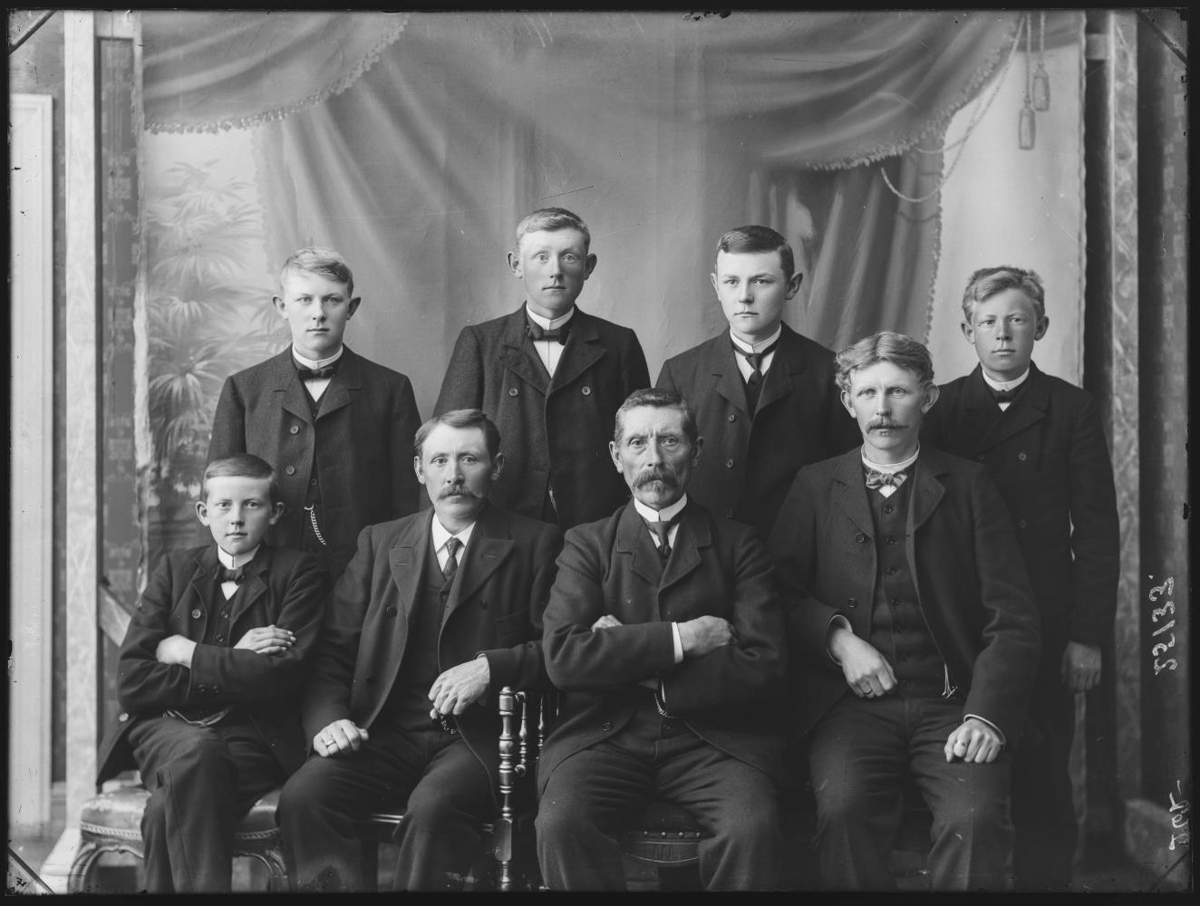 Böðvar Böðvarsson (gestgjafi) í Hafnarfirði, með syni sína. Efri röð: Þorvaldur, bóndi á Þóroddsstöðum í Hrútafirði, Theodór, Þórarinn útgm. í Hafnarfirði og Magnús, bakari í Hafnarfirði. Neðri röð: Páll verzlm. í Hafnarf., Böðvar, fyrst bóndi og síðar kaupm. í Hafnarfirði, Böðvar gamli (faðir þeirra) og Ólafur sparisjóðbókari í Hafnarfirði.