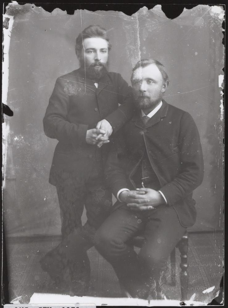 Tveir karlmenn. T.v. Kolbeinn Þorleifsson, búfræðingur og bóndi í Hróarsholti. Sá sem situr er óþekktur.
