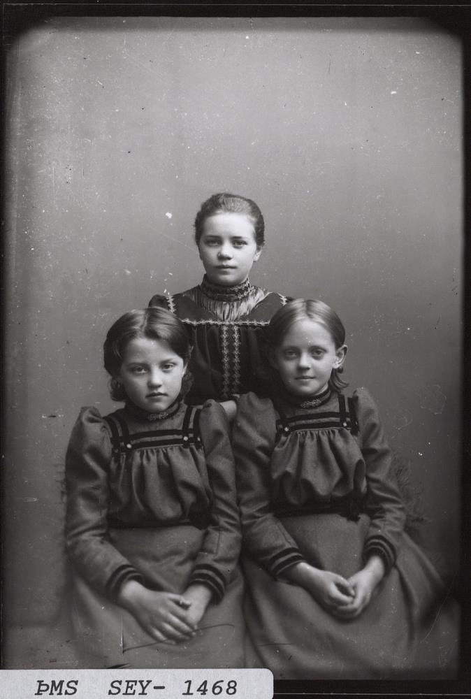 Aftast er sennilega Gyða Pétursdóttir Thorsteinsson, dó ung. Í fremri röð f.v. eru tvíburarnir Hildur Soffía Thorsteinsson og Guðrún Þorsteinsdóttir Thorsteinsson. Frænkur. Feður þeirra voru hálfbræður.