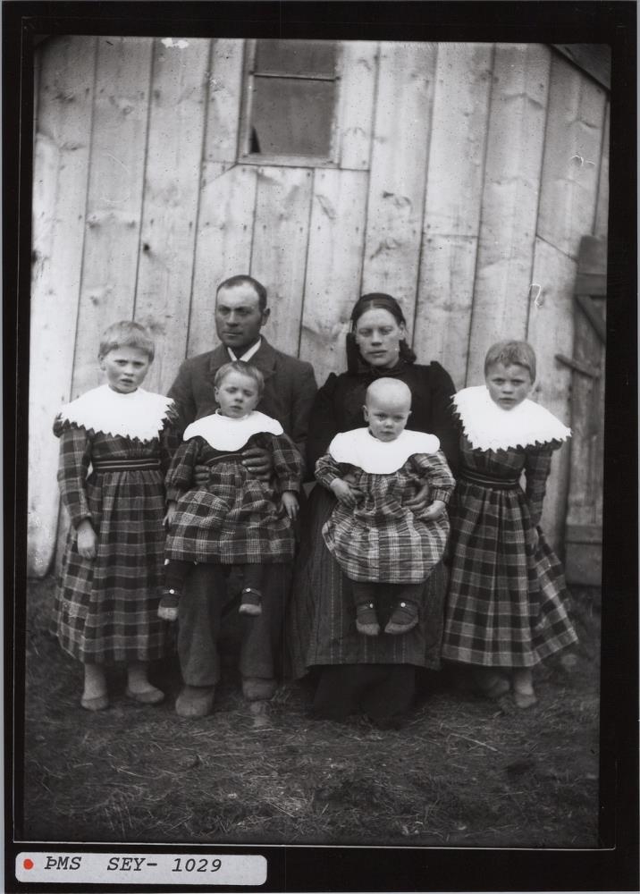 Hjón með fjórar dætur sitja utandyra fyrir framan timburhús. Stelpurnar eru allar klæddar í álíka köflótta kjóla með hvítum kraga. Yngstu dæturnar eru í fangi foreldra sinna en þær eldri standa sitt hvorum megin við þau.