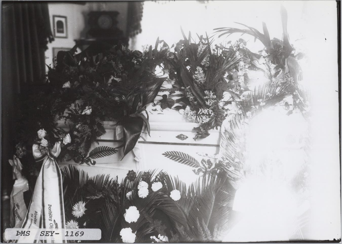 Líkkista þakin blómaskreytingum, á skreytingunum eru borðar merktir Þorbjörgu Olgeirsdóttur.
