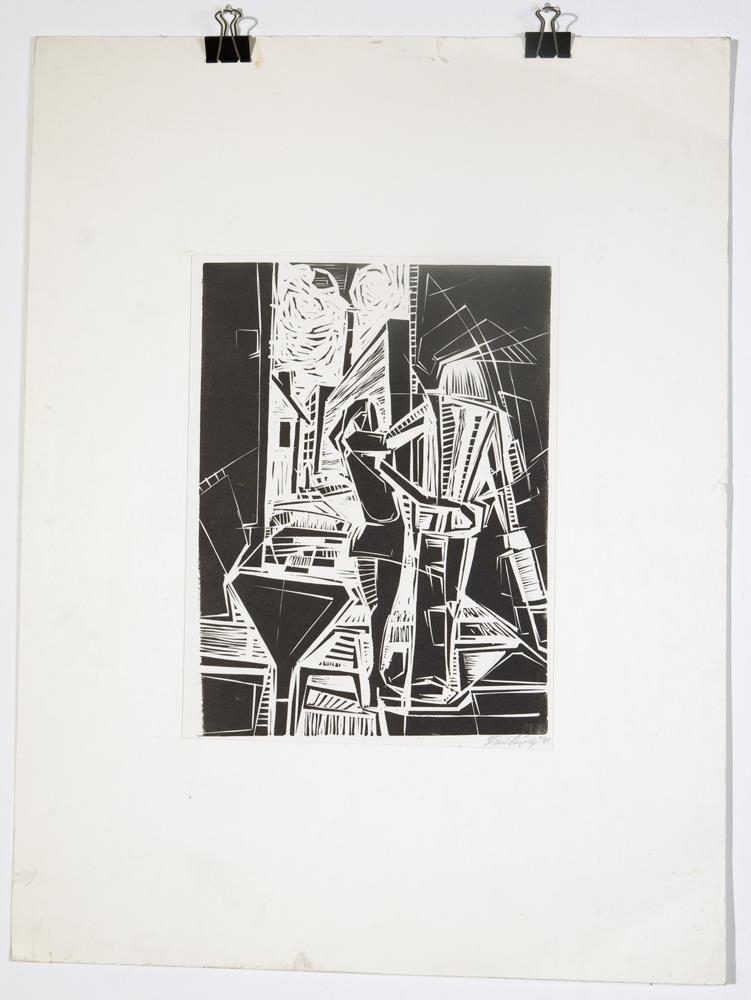Dúkrista - svört málning á hvítan pappír, mynd römmuð inn af þykku hvítu kartoni (framan og aftan)