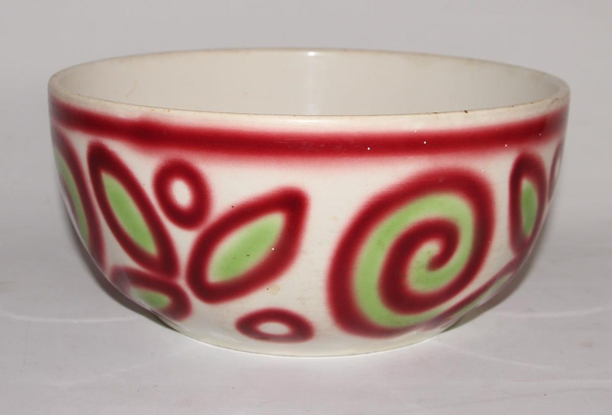 Skál úr leir. H. 10,5 cm. Þv. 21,5 cm. Er hvít á litin með rauðu og grænu mynstri, laufblöðum og hringjum. Neðan á er stimpill, á honum stendur 2707 UF Made in Saar-Basin- Villerog og Bock. Grafið er 2 neðan í hana. Skálin er aðeins bylgjótt að utan.