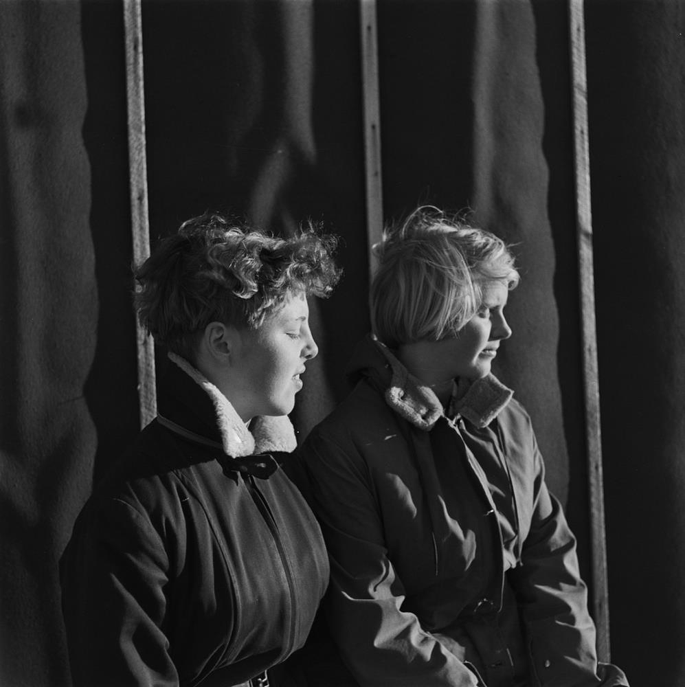 Dalasýsla. Mannvirki og starfsfólk við kolanámuna á Tindum á Skarðsströnd upp úr 1950. Október 1954. Anna Kristjánsdóttir á Tindum og Edda Karlsdóttir frá Klifmýri (Hvalgröfum). (Anna frá Tindum (þ.e. flutt þaðan) og Edda á Klifmýri (flutti þangað og býr þar enn).)