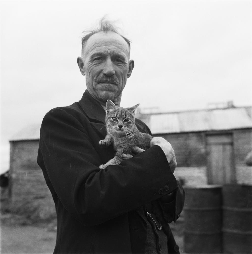 Karlmaður með kött í fanginu.