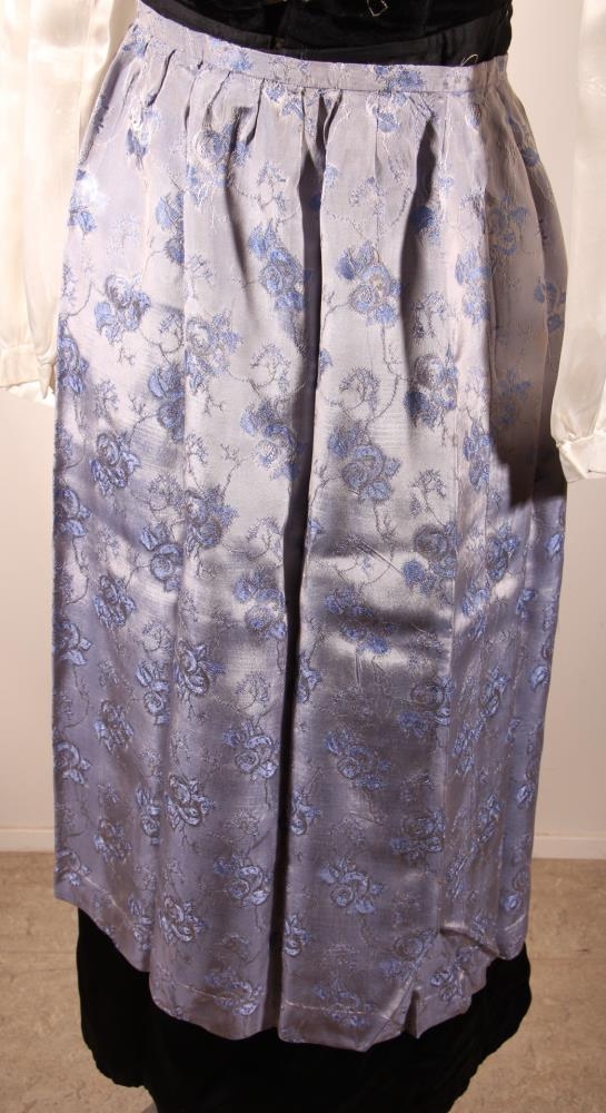 Svunta úr gylltu gerviefni L. í mitti er 85,5 cm. Sídd 82 cm. Strengur er 1,3 cm breiður. Brotið er upp á faldinn 6 cm. Brúnir eru kappmellaðar til að loka þeim. Drapplituð með gylltu og dröppuðu laufblaðamynstri. Var handsaumað af Sólveigu Kristjánsdóttur og það var í hennar eigu.