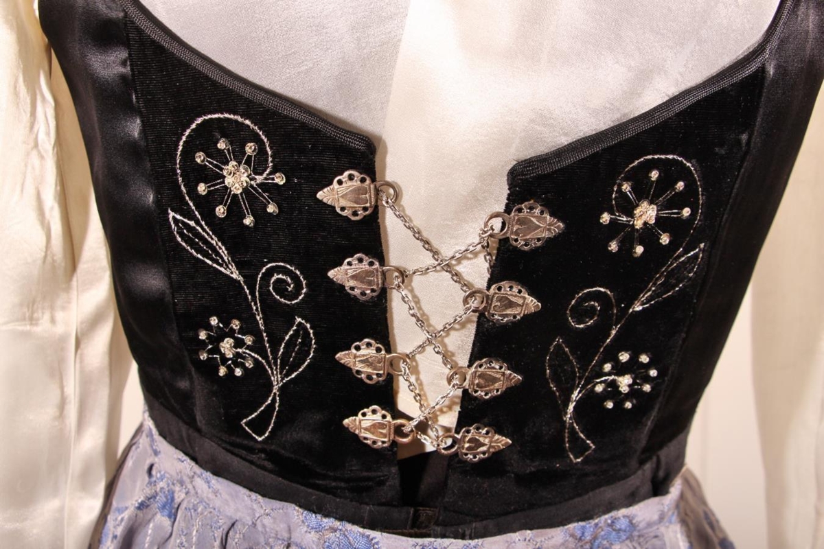 Upphlutur úr silkisatíni og flaueli með silfri, silfursaum og gylltum borðum. Mitti er 80 cm að ummáli. Sídd frá öxl að mitti eru 39 cm. Alls 47 cm. Breidd yfir bak 36 cm. Á baki og herðum eru gylltar leggingar með flaueli 0,8 cm breiðu á milli. Á brúnum er saumaður faldur úr grófara efni.