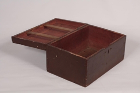 Kistill úr tré. Br. 31,5 cm. D. 20,7 cm. H. 15,7 cm. Geirnegldur saman. Botninn er negldur neðan á. Lokið er 3 cm hátt. Toppurinn er negldur ofaná. Lokið er sprungið. Búið er að setja tvær þverspýtur undir lokið. Er á tveimur frekar nettum hjörum. Búið er að taka læsingu og skráarlauf af. Aðeins skráargatið er á. Málaður brúnn.