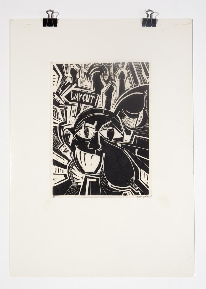 Svört-hvít dúkrista, römmuð inn í pappakarton. Afmyndað mannsandlit - svolítið apalegt - horfir til áhorfanda. Bakgrunnur er fylltur af formum, mögulegar bækur, einnig sést í skilti sem á stendur 'way out' .