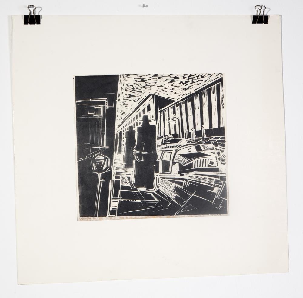 Svört dúkrista, önnur einingin á hvítan pappír, hin á brúnan maskínupappír en sama myndefnið á þeim báðumMyndirnar eru rammaðar inn í karton. Grafíkpappírinn er límdur á framhlið rammans með límbandi. Myndefni: Fjórar mannsfígúrur sem labba í röð í borgarumhverfi sem einkennist af skörpum, geometrískum línum. Fígúrurnar labba við umferðargötu þar sem sjá má tvo bíla, auk þess sem hinum megin við götuna má sjá aðrar mannfígúrur