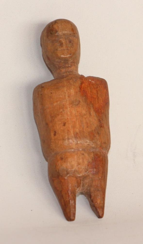 Trékarl, tálgaður. H. 7,5 cm. L. 2,8 cm. Br. 1,6 cm. Hann er handalaus en með tvo fætur sem eru oddmjóir niður. Hálsinn er grannur og ennið mikið og stendur fram. Lítur út fyrir að vera hálfkláraður.