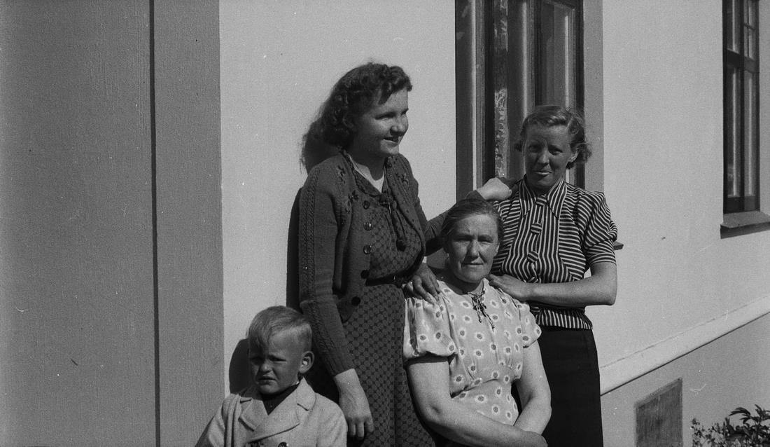 Túngata 1. Ísafjörður. Þrjár konur og drengur við húsvegg. 1939. Áður HRB4-1.1.6.