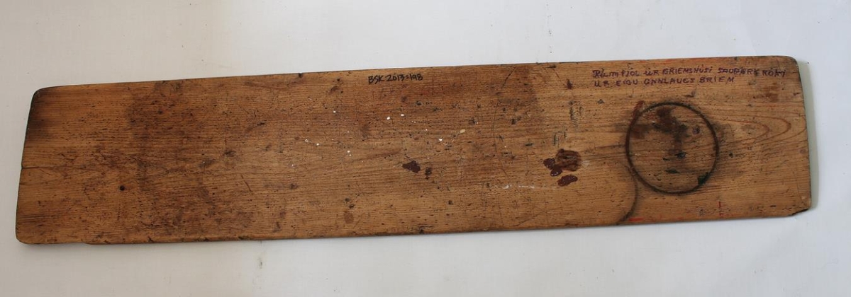 Rúmfjöl úr furu. L. 93,5 cm. Br. 19,7 cm. Á bakhlið, sem er töluvert marin og pikkuð, stendur „RÚMFJÖL ÚR BRIEMSHÚSI SAUÐÁRKRÓKI ÚR EIGU GUNNLAUGS BRIEM". Á bakhliðinni er einnig svartur hringur og blettir. Framan á eru brúnir fjalarinnar strikaðar og á henni eru 3 hringir. Lengst til vinstri eru upphafsstafir GHD. Í miðju kringlunni eru upphafsstafir IHS og lengst til hægri er í þriðju kringlunni ártalið 1865.