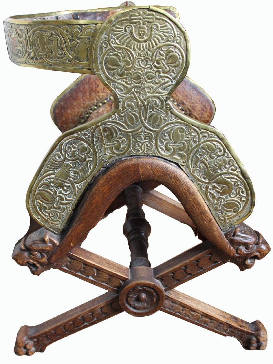 Hellusöðull úr furu, eltiskinni og látúni (með koparnöglum). Söðullinn er á tréstól og hefur hann verið nýttur a.m.k. síðustu öldina sem stóll eða stofustáss. H. söðulsins er 73 cm. Dýpt 59,5 cm. Br. 53 cm (milli stólfóta). Fæturnir eru 3,5 x 4,5 cm að ummáli. Sveifin er H. 8,5 cm. Br. 1 cm. Alls er söðullinn H. 37 cm. Br. 48 cm. Setan er Br. 34 cm. L. 42 cm. Brík og sveif eru lagðar drifnu og gröfnu látúni (mynstur sem var stappað í málm og varð upphleypt var kallað drifið). Beitur hylja allar brúnir. Í látúnið er grafið blómamynstur og dýramyndir (ljón, hjörtur, hundur, björn, einhyrningur og fíll) í barokkstíl. Skammstöfunin TH Id eða TH Jd og ártalið 1766 er einnig grafin á vinstri hlið og á báðum hliðum er engill. Stólfæturnir mynda X hvoru megin og milli þeirra er rennd slá. Fjögur ljónshöfuð eru útskorin á efri enda fótanna. Setan er úr eltiskinni. Skinnið er þrykkt með nokkurs konar krossamynstri, það er afar slitið og nokkuð illa farið. Sést í léreftsdúk og hestsnoð í setu, sem notað er sem stopp til að mýkja setuna. Framan á setunni er kögur L. 5,5 cm.