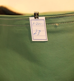 Hluturinn er skólataska græn að lit með tveim smellum og axlaról. Skinnið er frá Skinnaverksmiðjunni Iðunni, Akureyri.