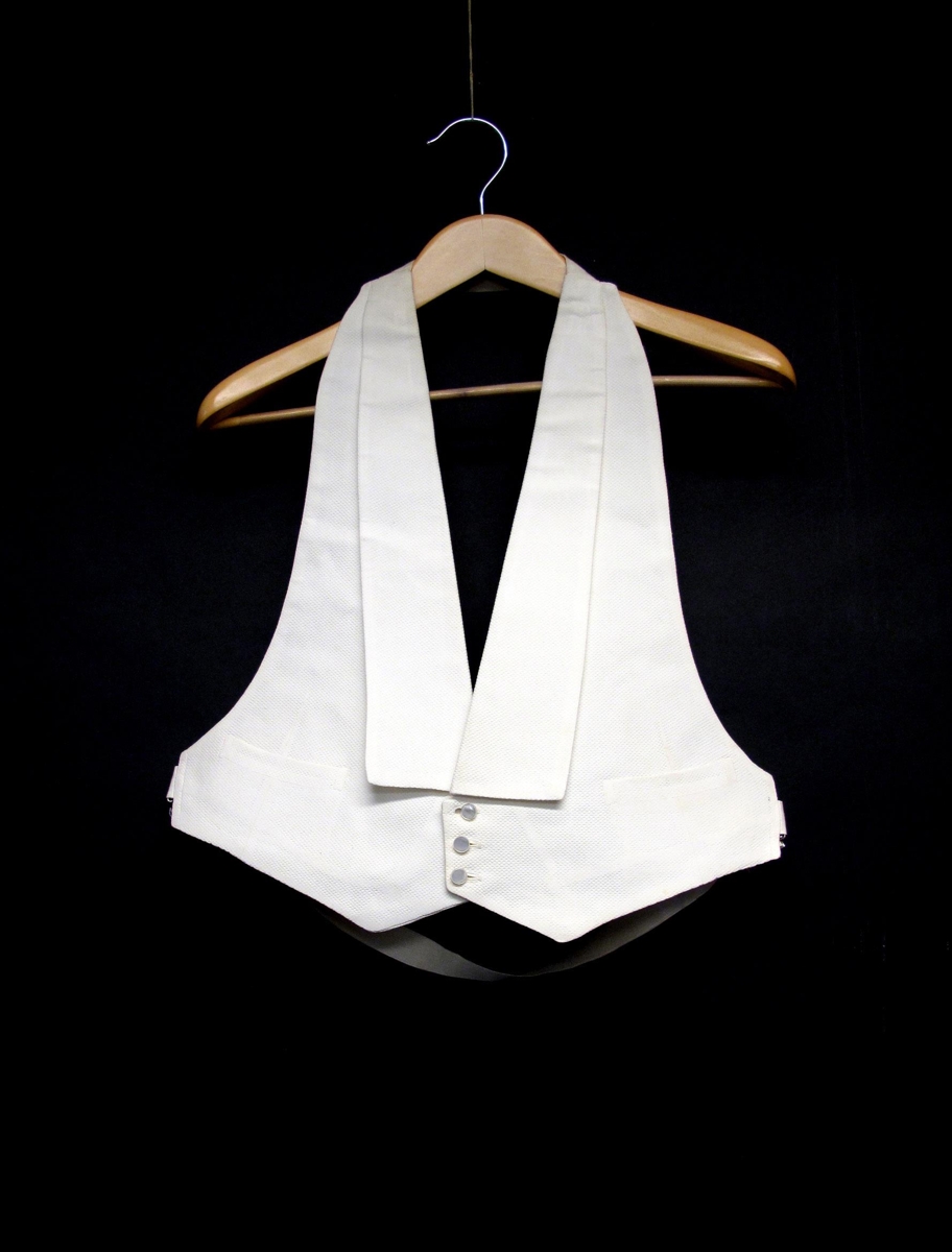 Kjólfatavesti, hvítt úr hömruðu lérefti. Baklaust en með teygju sem nær aftur fyrir bak í mittið. Þrír hnappar neðst að framan, með perluáferð. Vasi í sitthvorri hlið. Léreftsband sem liggur aftur með hnakka sem hægt er að stilla af með tölum. Merkt með miða að innan: AKCO TAILORED VEST COTTON 42 MADE IN ENGLAND. Einnig merkt með penna á sitthvort brjóststykkið innanvert: J-J sem stendur væntanlega fyrir upphafsstöfum fyrrum eiganda, Jóhanns Jósefssonar. Sennilega frá 1930 - 1950.
