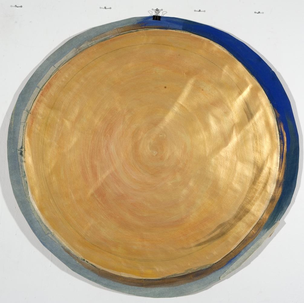Brúnt karton skorið í hring. Annar minni hringur er límdur á hann með málningarlímbandi. Stærri hringurinn er málaður ljós- og dökkblár. Minni hringurinn málaður gullitaður sem er með smá rauðum blæ