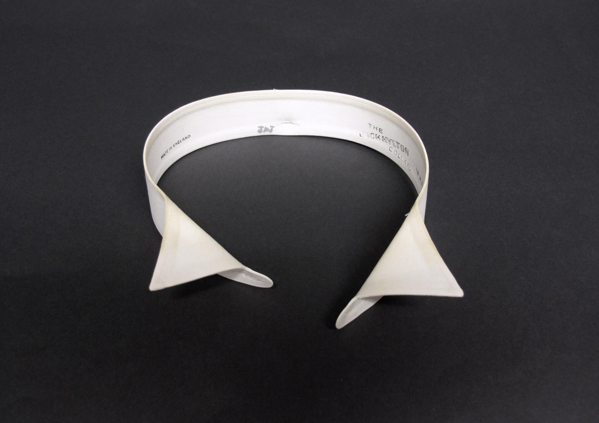 Flibbi, hvítur, stífður, einfaldur úr lérefti. Hnappagat neðst að aftan og fyrir miðju að framan. Orðinn nokkuð gulur efst. Merktur: THE HACK HYLTON COLLAR. MADE IN ENGLAND. Stærð 1 ¾ x 17 ½. Einnig merktur með penna JÞJ sem eru upphafsstafir fyrri eiganda Jóhanns Þ. Jósefssonar. Þvermál ca. 15 cm. Á ensku svokallaður „wing collar". Sennilega frá 1910 - 1950. Gripir nr: Þjms. 2012-85-88, 89, 90, 91, 92, 93 eru eins (92 og 93 eru hálfu númeri minni).