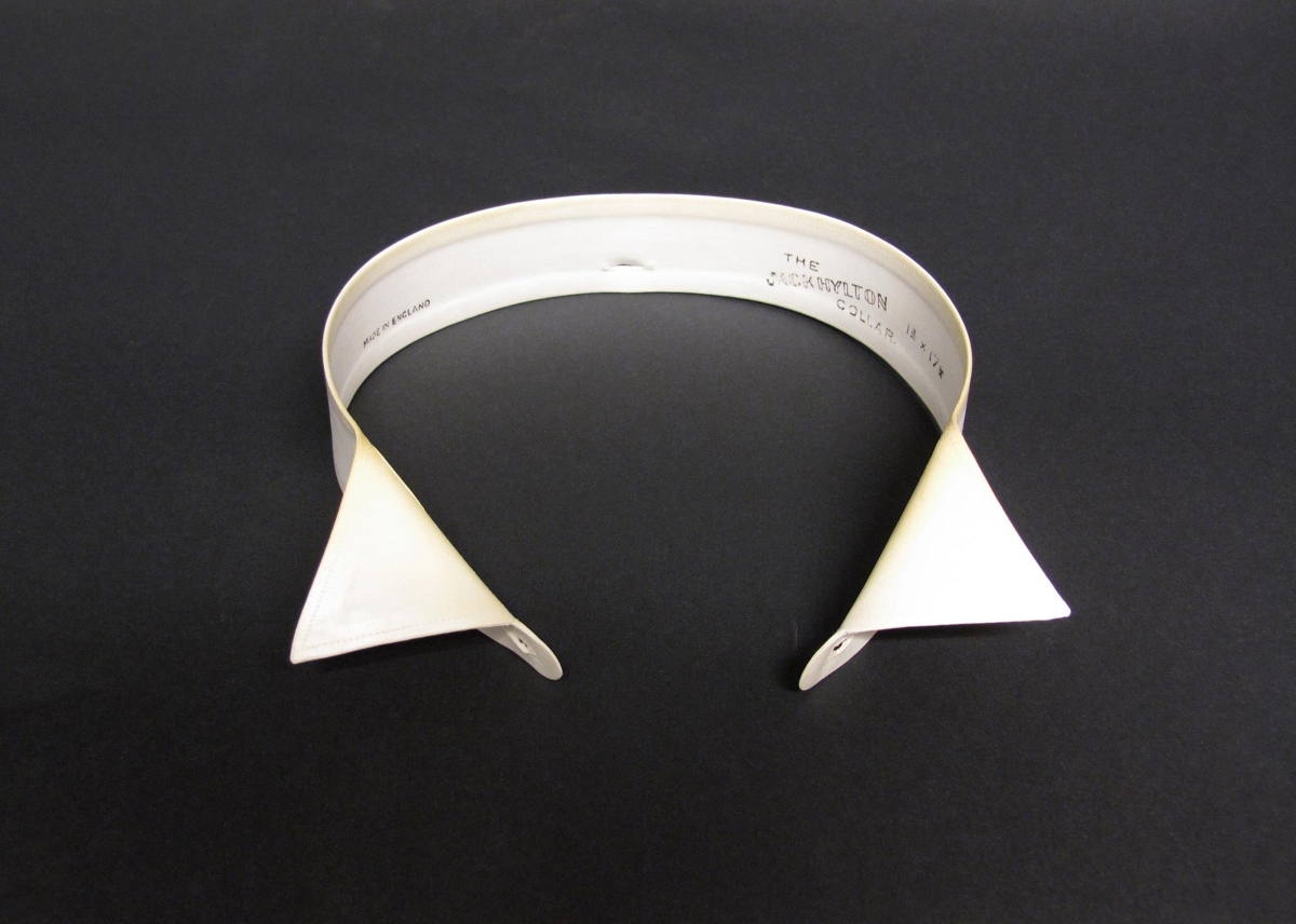 Flibbi, hvítur, einfaldur úr stífðu lérefti. Hnappagat neðst að aftan og fyrir miðju að framan. Orðinn nokkuð gulur efst. Merktur: THE HACK HYLTON COLLAR. MADE IN ENGLAND. Stærð 1 ¾ x 17 ½. Þvermál ca. 15 cm. Á ensku svokallaður „wing collar". Sennilega frá 1910 - 1950. Gripir nr: Þjms. 2012-85-88, 89, 90, 91, 92, 93 eru allir eins (92 og 93 eru hálfu númeri minni).