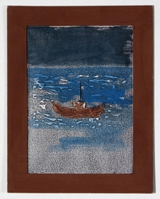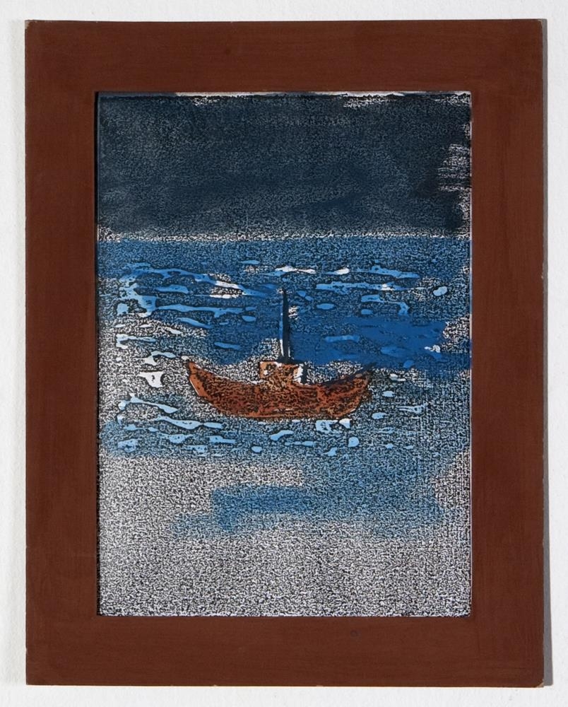Tvær einingar - ljósrit, römmuð inn með bókbandspappa, máluðum brúnum. Verkin eru límd á ramman með glæru pappírslímbandi. Listamaður hefu ljósritað grafíkverk (dúkristu) og málað ljósritin með akrílmálningu. Myndefnið er af bát á vatni. Á öðru verkinu er málað landslag í kring.