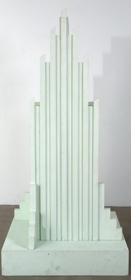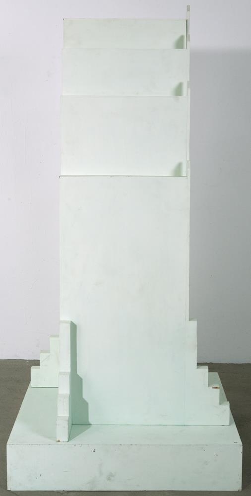 Turn á stöpli - minnir á kirkjuturn. Turn laus frá stöpli. Stíll minir á art-decoTurninn er samansettur úr 4 ferningum sem er raðað ofan miðju á hvers annars - stærsti neðst, minnsti efst - Við það myndast stallar hvorum megin við hvern ferning (hálfgerður tröppu gangur), samtals 6 stallar, 1 toppurFraman á eru 7 þunnar skáskornar spýtur. Þær ná örlítið hærra en stallarnir (oddurinn upp) og undirstrika tröppuganginn í verkinu.Neðst á turninum, alveg við stöpulinn, eru spýtur með tröpugangi, samtals 4 og snúa hver í sína áttina