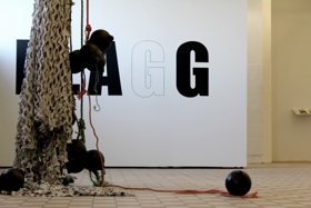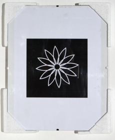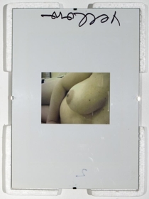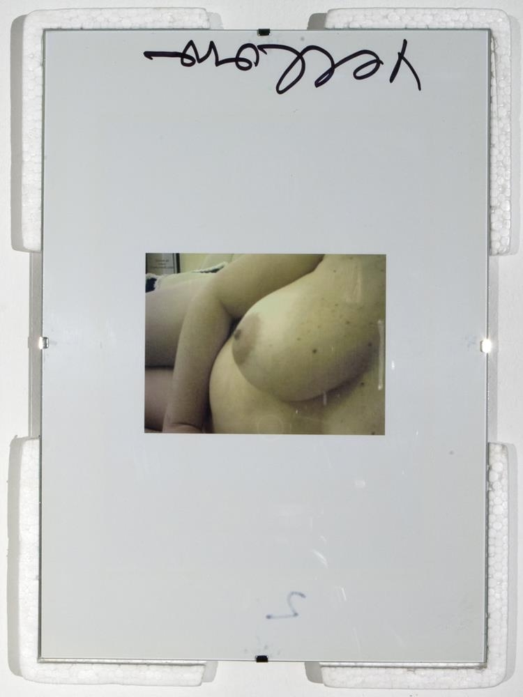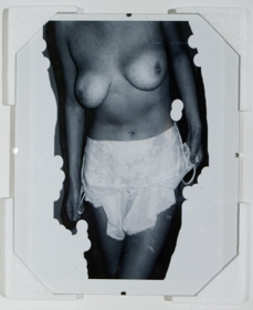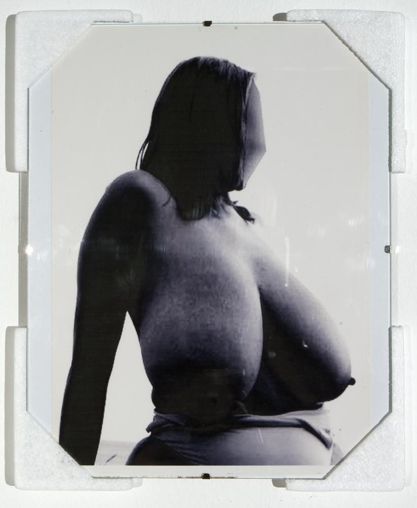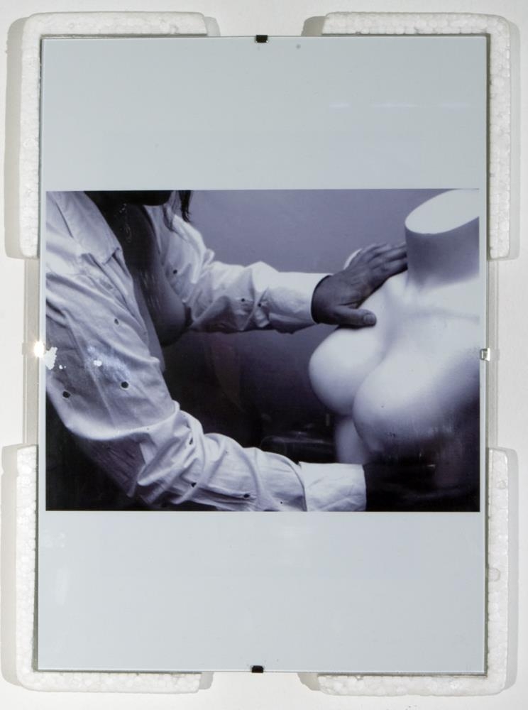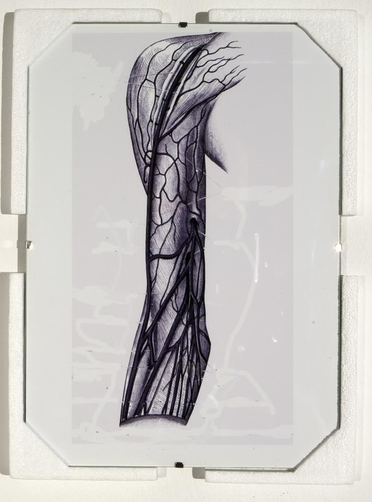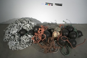 7 ljósmyndir í glerrömmum og hvítu einangrunnarfrauði, 2 sett af netadræsum og flotholtum- 5 ljósmyndir af berum kvenmannsbrjóstum, 1 ljósmynd af blómi í hvítum útlínum á svörtum grunni, 1 ljósmynd af teiknuðum vöðva og æðakerfi handleggs- 2 sett af netadræsum, reipum og svörtum flotholtum