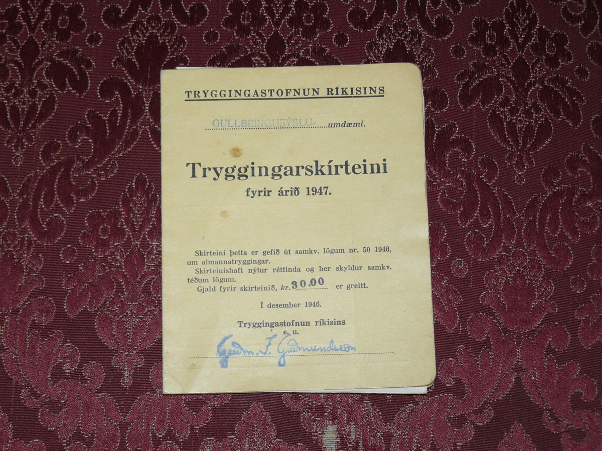 Tryggingaskírteini fyrir árið 1947, stílað á Svanhildi Guðjónsdóttur (1907 - 1993) frá Réttarholti í Garði. Gefandi munar: Eiður Guðnason fyrrum fréttamaður, systursonur Svanhildar.