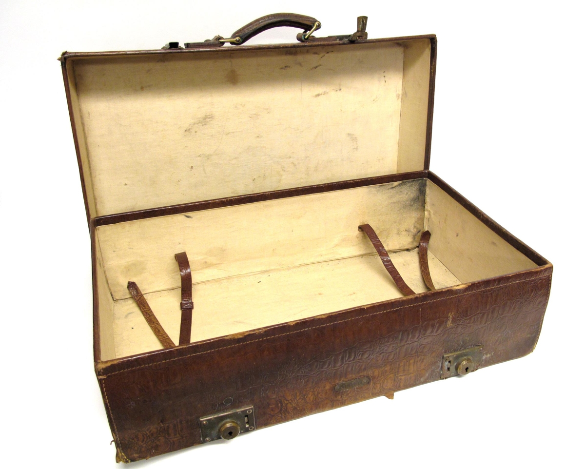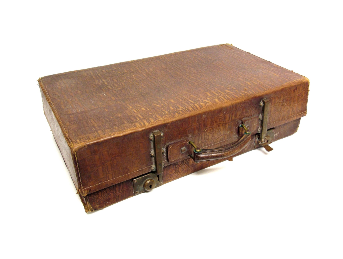 Ferðataska úr brúnu leðri, sennilega krókódílaskinni. Kantarnir eru allir stungnir með grófum tvinna. Handfang úr leðrinu á annarri langhliðinni ásamt tveimur veglegum kopar-smellum og læsingum. Hluti af annarri smellunni er brotinn af og horfinn. Lágir fætur á hinni langhliðinni ásamt lömum úr kopar. Fóðruð að innan með lérefti sem talsvert er farið að láta á sjá. Tvær leðurólar að innan sem notaðar hafa verið til að festa farangurinn. Sennilega frá1910 - 1940. Í töskunni voru gripir nr.: Þjms. 2012-85-82 – 104.