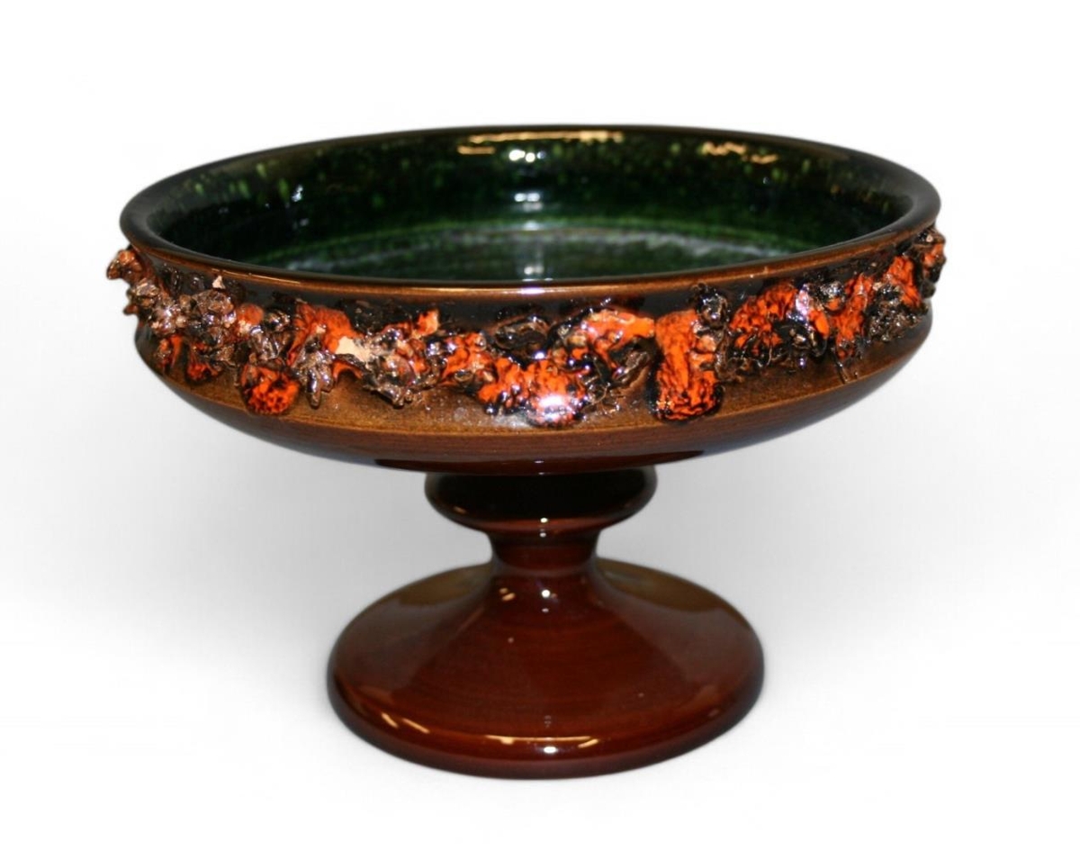Stór glerjuð keramikskál á fæti, skreytt með "hrauni". Græn að innan, brún að utan. Framleidd af Funa.