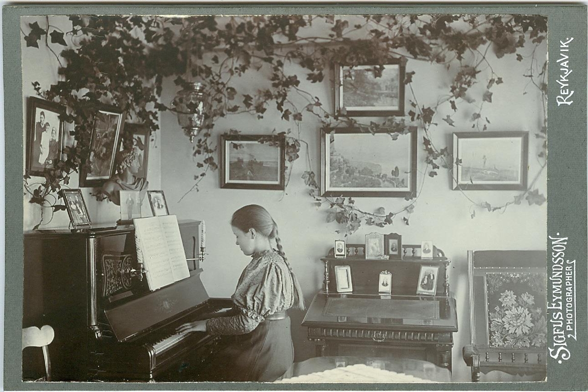 Ung stúlka situr og spilar á píanó í stofu. Pottablóm liðast um loft stofunnar. Myndir á veggjum og í römmum á píanói og skrifpúlti. Stytta. Útsaumað bak á stól. Þekkja má Sigríði Bogadóttur biskupsfrú, Þóru Pétursdóttur Thoroddsen og Sigríð Thoroddsen saman á einni myndanna. það gæti bent til að stofan sé hjá einhverju ættmenni þeirra.