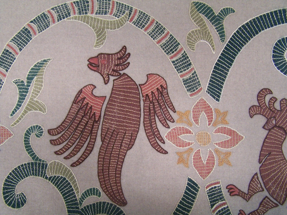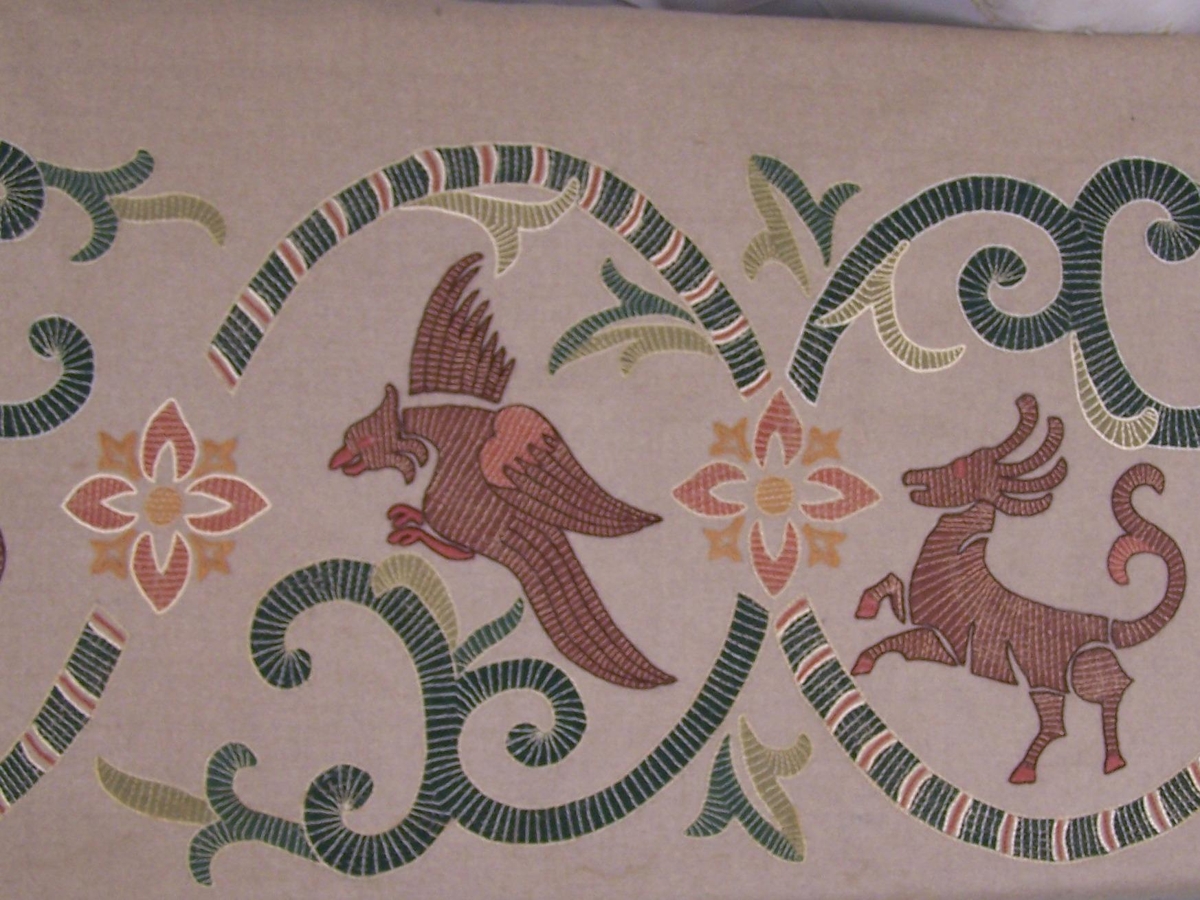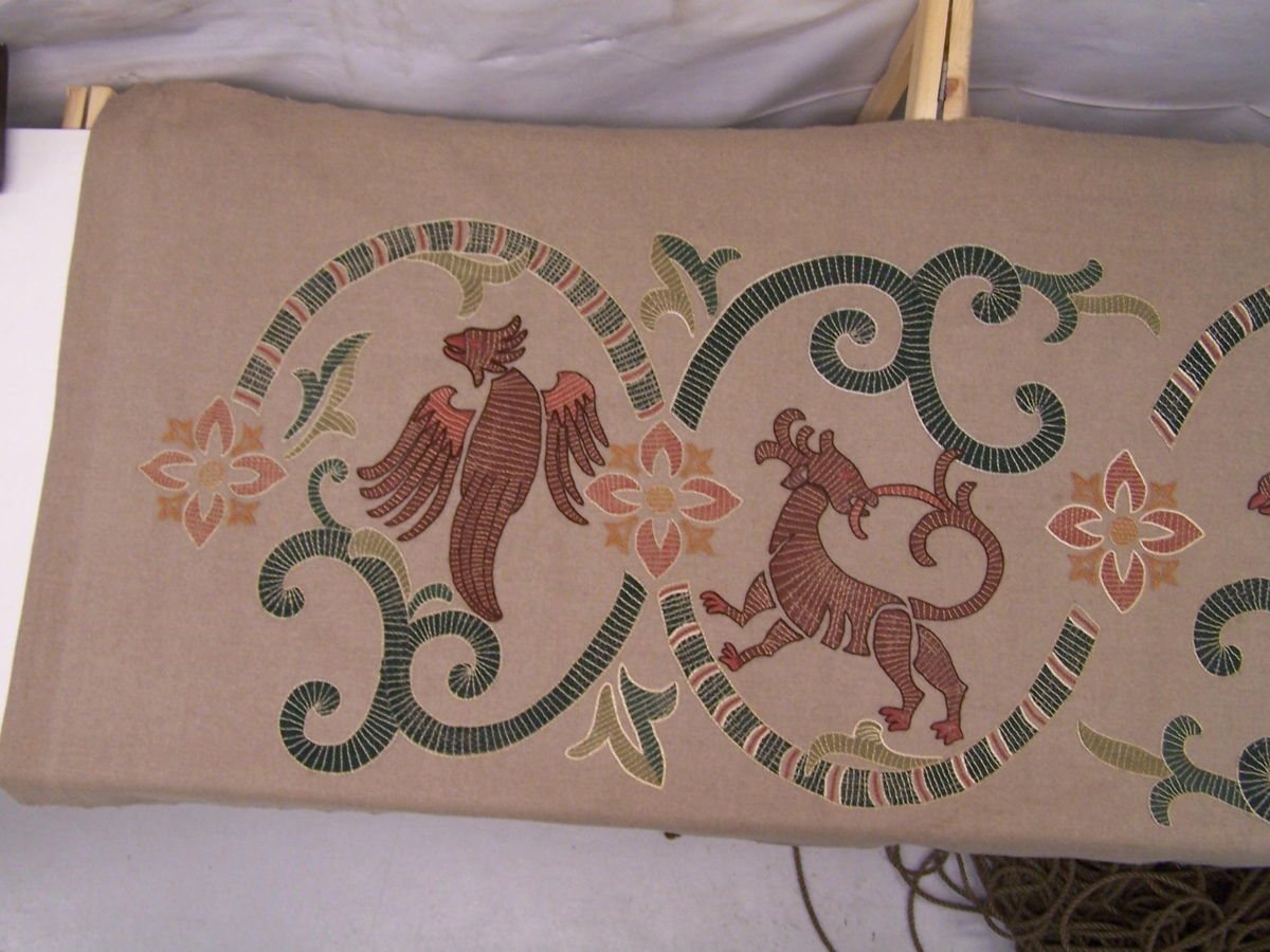 Útsaumað veggteppi með vafningum og drekamyndum. Kantar ófaldaðir. Ljósbrúnn ullarjavi, litir í útsaumi: grænn, brúnn (margir tónar), rauður.