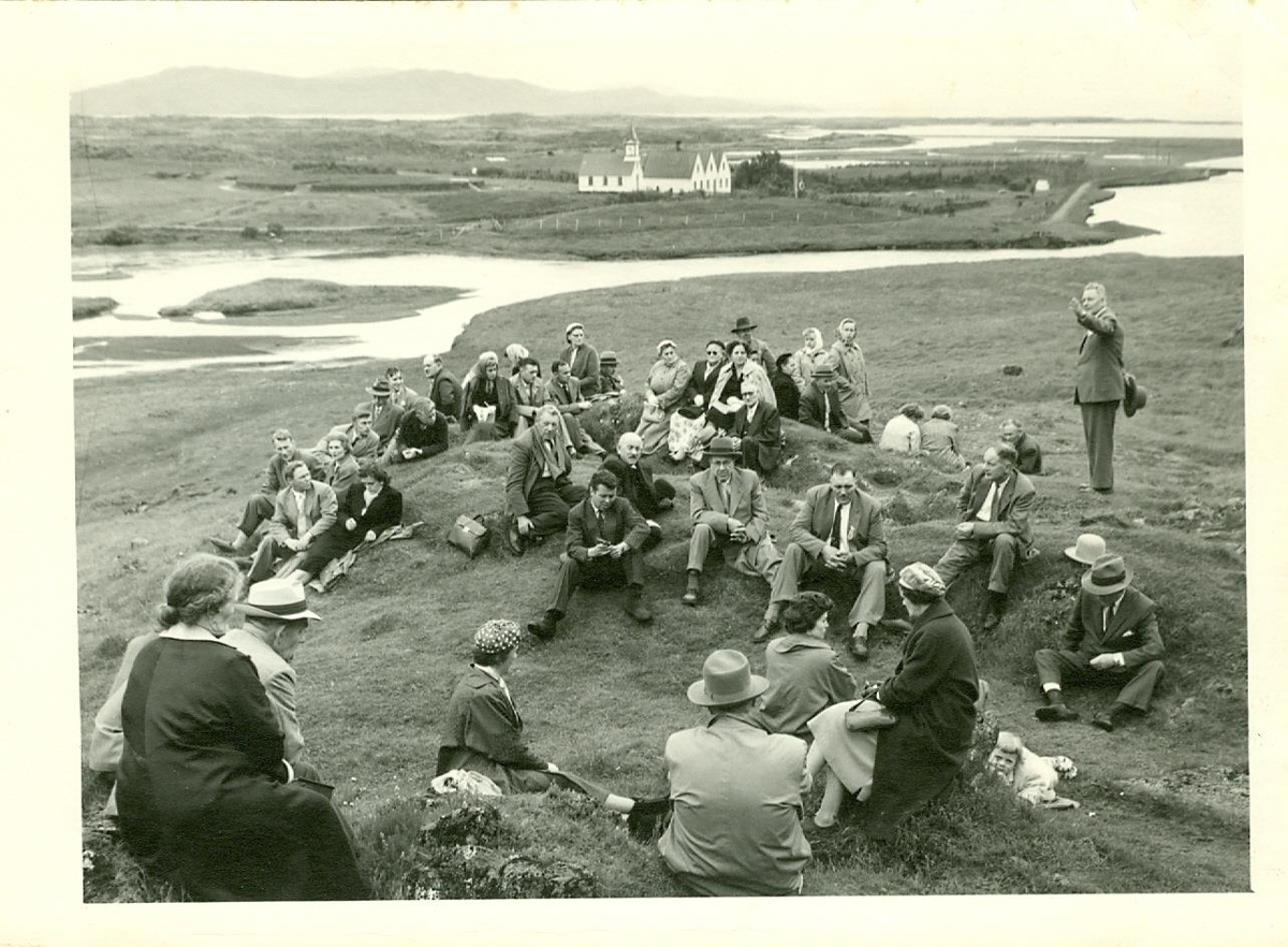 Hópur sparibúins fólks situr í tóftarbrotum og hlýðir á mann segja frá. Sér niður að á og kirkjustað. Guðni Jónsson talar yfir hópi fólks líklega úr Árnesingafélaginu í Reykjavík.