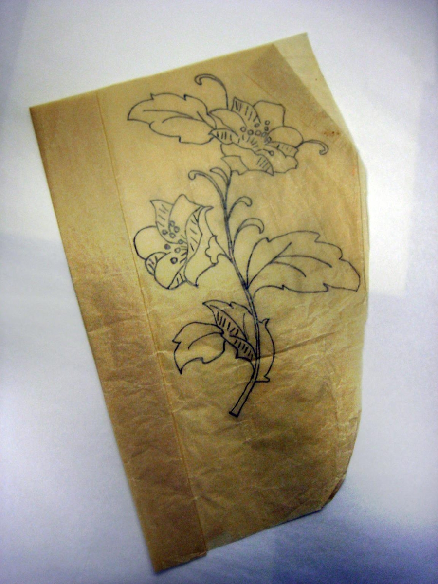 Teikning af blómi eða rós sem er dregin á smjörpappír. Líklega er um að ræða uppdrátt fyrir útsaums mynstur.