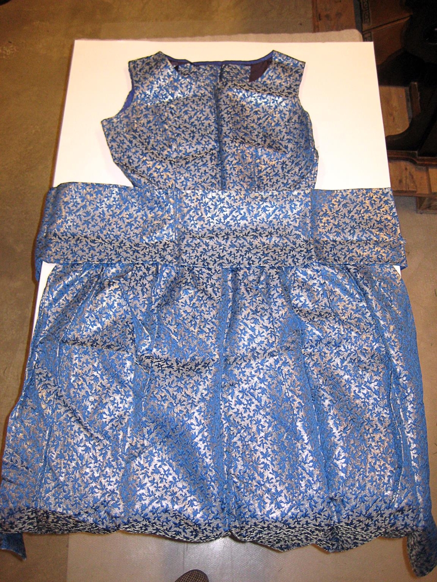 Nokkrir hlutar úr ókláruðu saumaverkefni. Um er að ræða toppstykki, slifsi og svuntu úr sama efni. Efnið er blátt með silfruðu blómamynstri. Líklega hefur verið um skrautbúning eða fínan kjól að ræða.