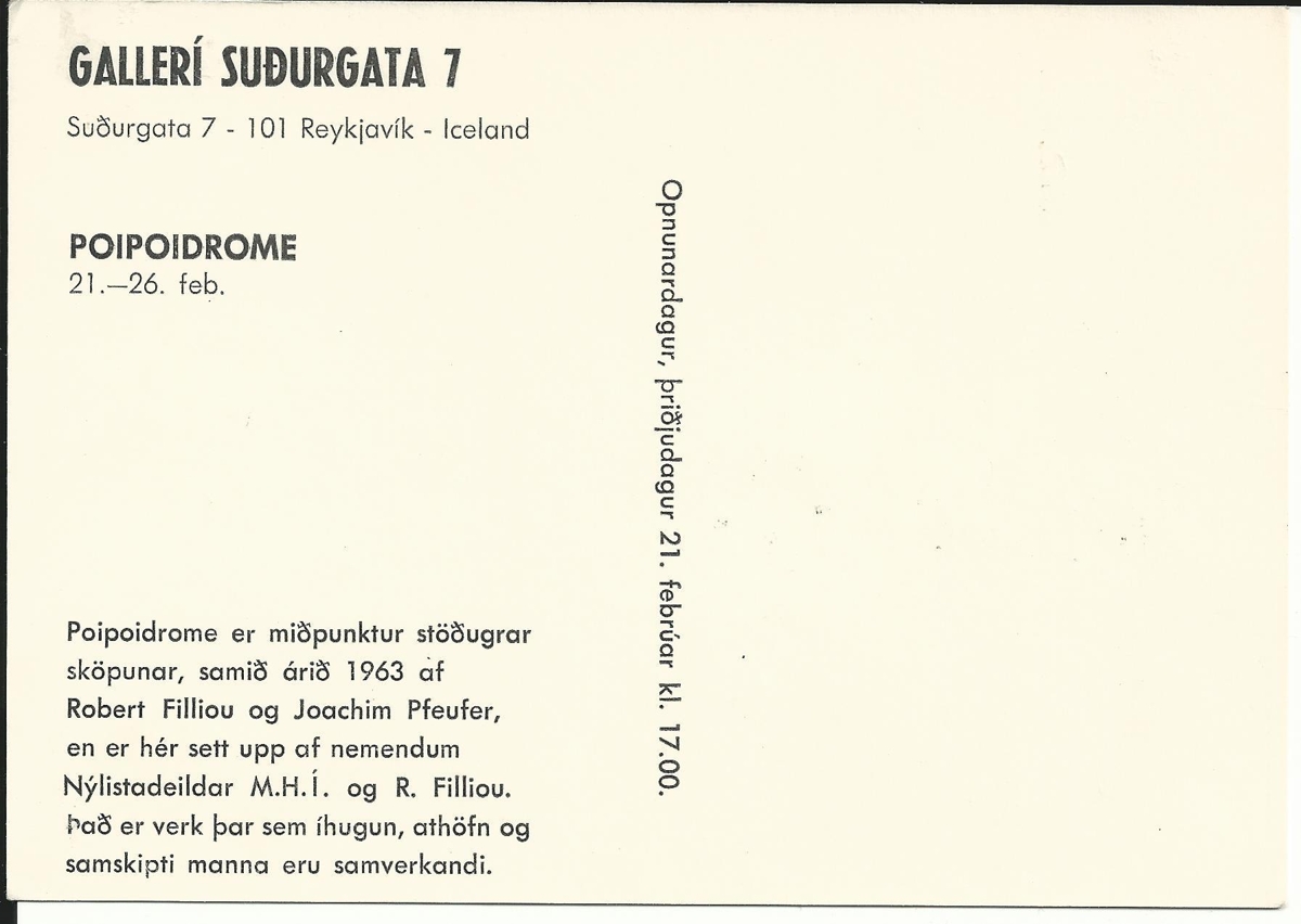 Verkið var framkvæmt af Robert Filliou- ásamt nemendum í Nýlistadeild Myndlista- og handíðaskólans. Þau gáfu sýninguna „Poipoi drome" til Nýló.