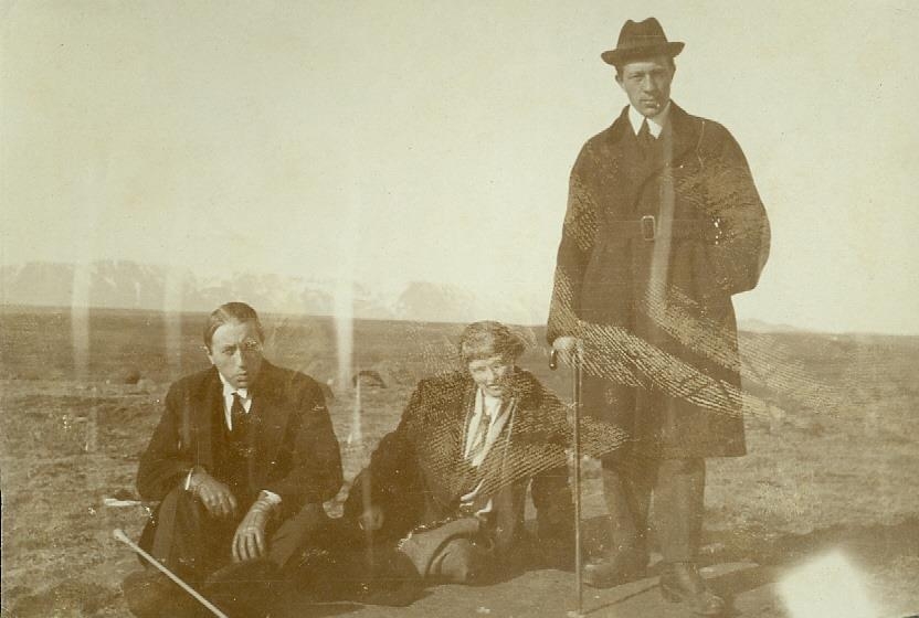 Óþekktur maður og kona sitja úti við. Hallgrímur Sigtryggsson stendur hægra megin á myndinni. Í baksýn sést Esjan.