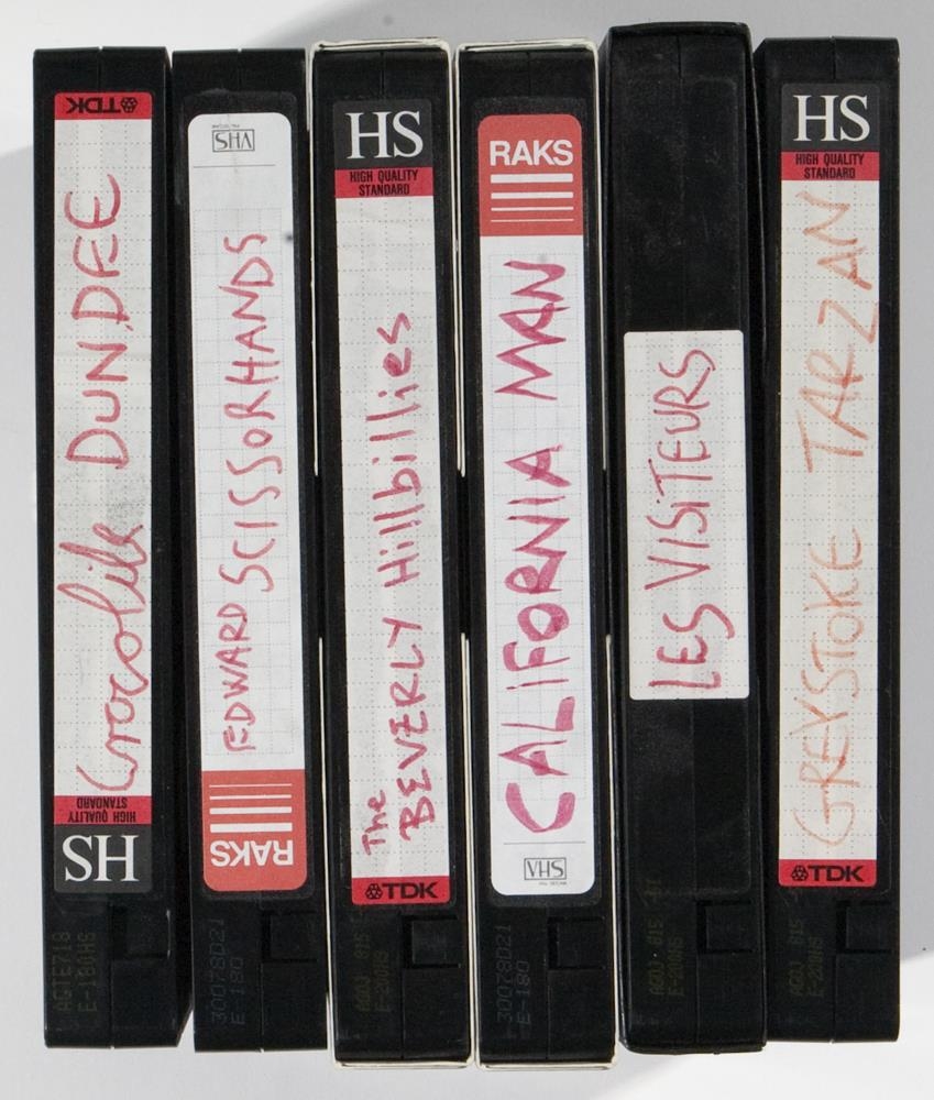 6 svartar VHS-spólur. Titlar myndanna skrifaður með rauðum túss á hlið og ofan á spólunum- Crocodile dundee, Edward Scissorhands, The Beverly Hillbillies, California man, Les Visiteurs, Greystoke Tarzan.