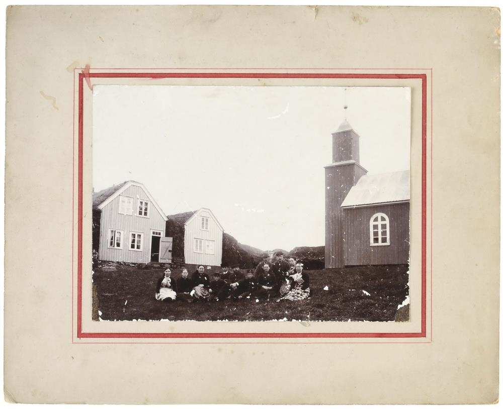 Heimilisfólk hefur sest í hnapp framan við bæjarhús. Alls tólf manns. Tvær burstir torfbæjar, útihús og kirkja í bakgrunni. Sneiðing á burstum torfbæjarins að ofan. Þekkja má hér Jón Ó. Magnússon prest fyrir miðri mynd með syni sína á hvora hönd þá Þorstein og Magnús og konu hans Steinunni Guðrún Þorsteinsdóttur.