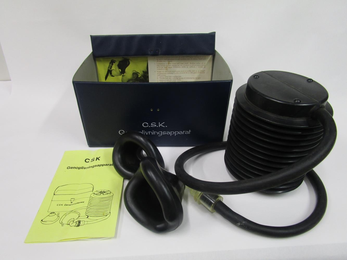 C.S.K. Genoplivningsapparat. Endurlífgunartæki. Öndunartæki sem notað var í Sundlaug Stykkishólms á seinni hluta 20. aldar. Meðfylgjandi eru: "Leiðbeiningar við lífgun úr dauðadái með C.S.K öndunartækinu." Tækið er þenslukútur sem þrýst er saman og gríma sem sett er fyrir munn og nef. Á milli belgs og grímu er slanga sem flytur loftið. Tvær mismunandi stórar grímur fylgja tækinu og leiðbeiningar á dönsku og íslensku.