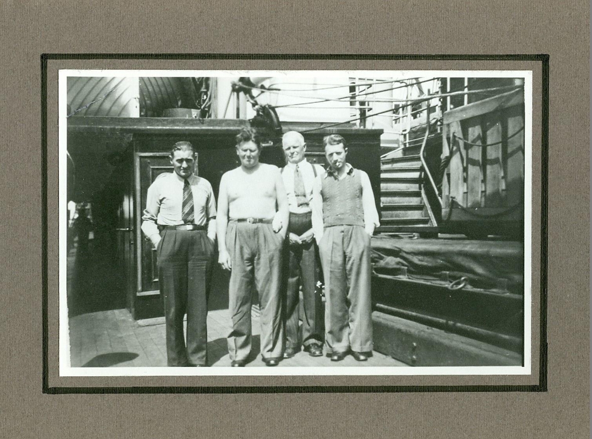 Fjórir menn um borð í farþegaskipinu Gullfossi. 1-4 vélstjóri skipsins,Tómas Guðjónsson, Jón Bjarnason, Harladur Sigurðsson og Lárus Scheving.
