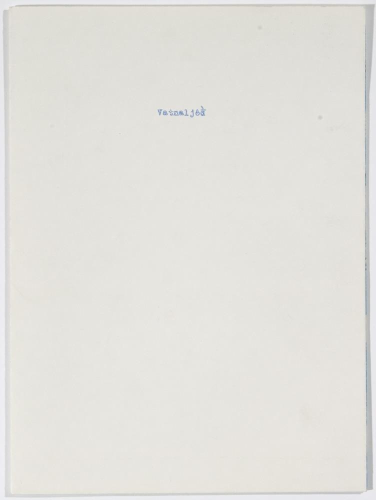 Bókverkið er harmonikkubók með 4 bls. Blaðsíðurnar eru prentaðar með bláum pensilförum (original off-set). Förin eru dregin yfir allar síður og orðið ´Vatnaljóð´ skrifað yfir. Kápan er hvít, titill vélritaður í bláu. Nafn höfundar aftan á.