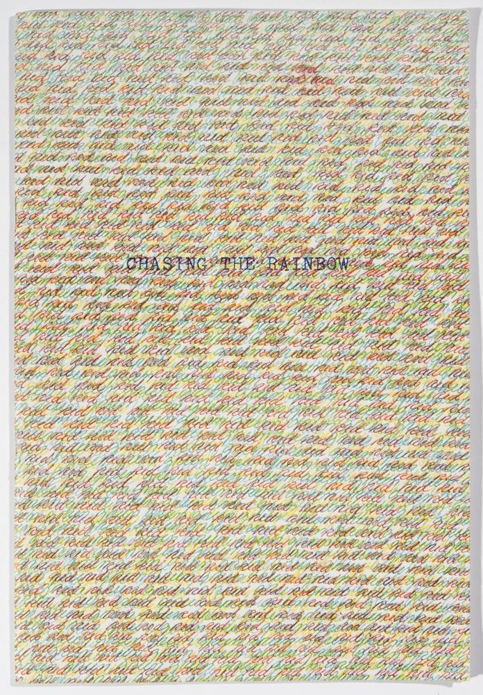 Bókverkið er 16 bls. Orðin yellow, red, green, blue eru prentuð (original off-set) í sömu litum, þétt ofan í hvert annað. Prentað á báðar hliðar blaðsíðna sem og á báðar hliðar kápu. Kápan er eins og síðurnar inni í bókinni með titli fyrir miðju.