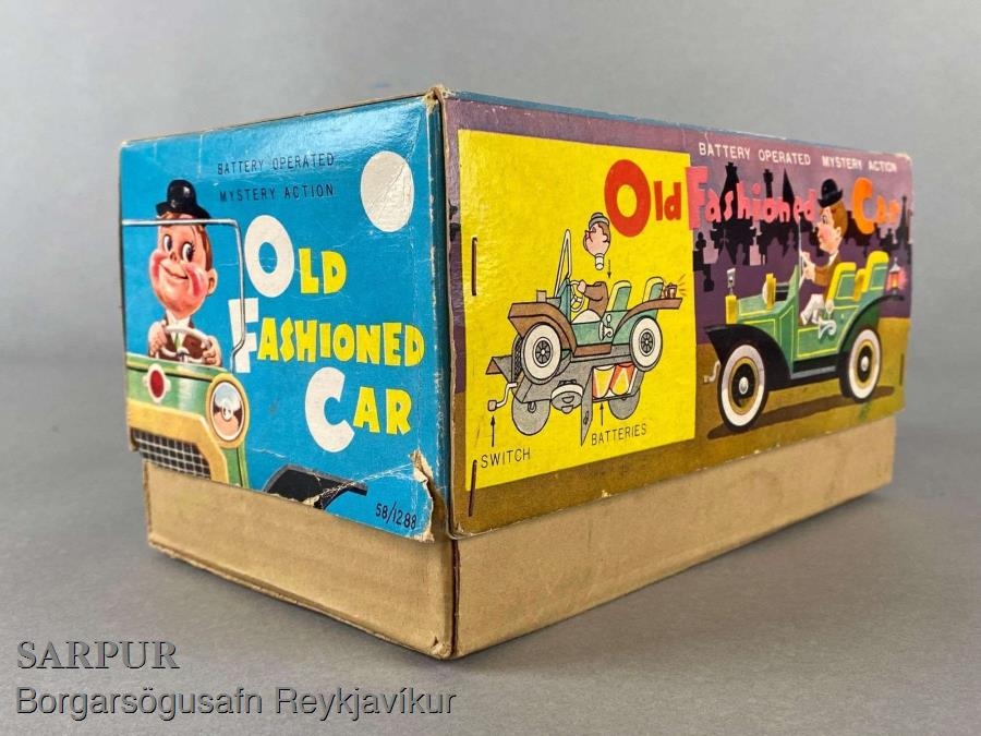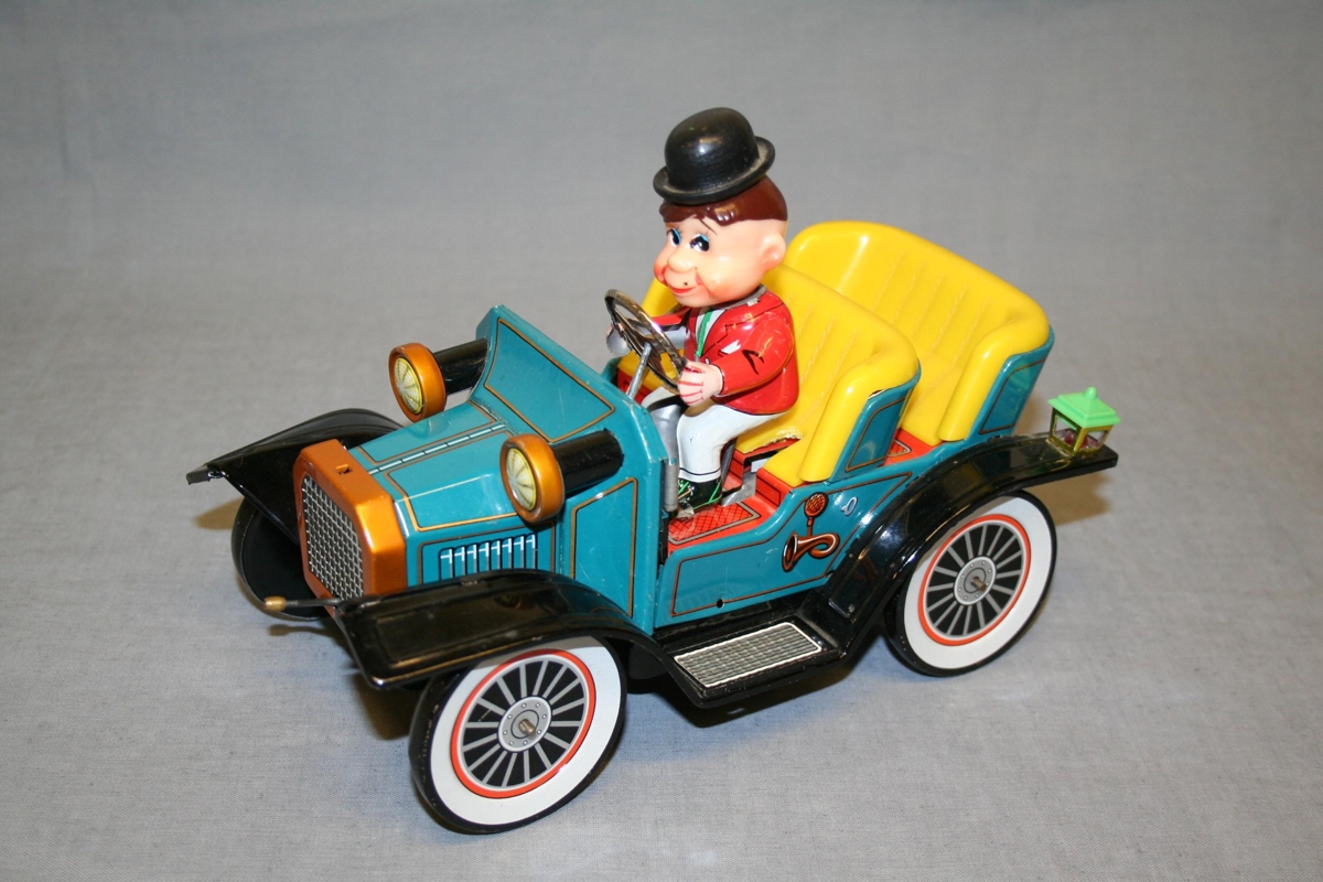Leikfangabíll sem gengur fyrir batteríum. Við stýrið situr maður með hatt.
